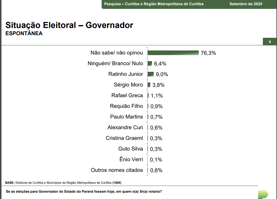 O levantamento também questionou os entrevistados sobre as candidaturas para o Senado. No cenário em que o entrevistado poderia citar dois nomes, Ratinho Junior aparece com 67,5%; Alvaro Dias com 40,8%; Beto Preto com 19,7% e Renato Freitas com 12,6%.