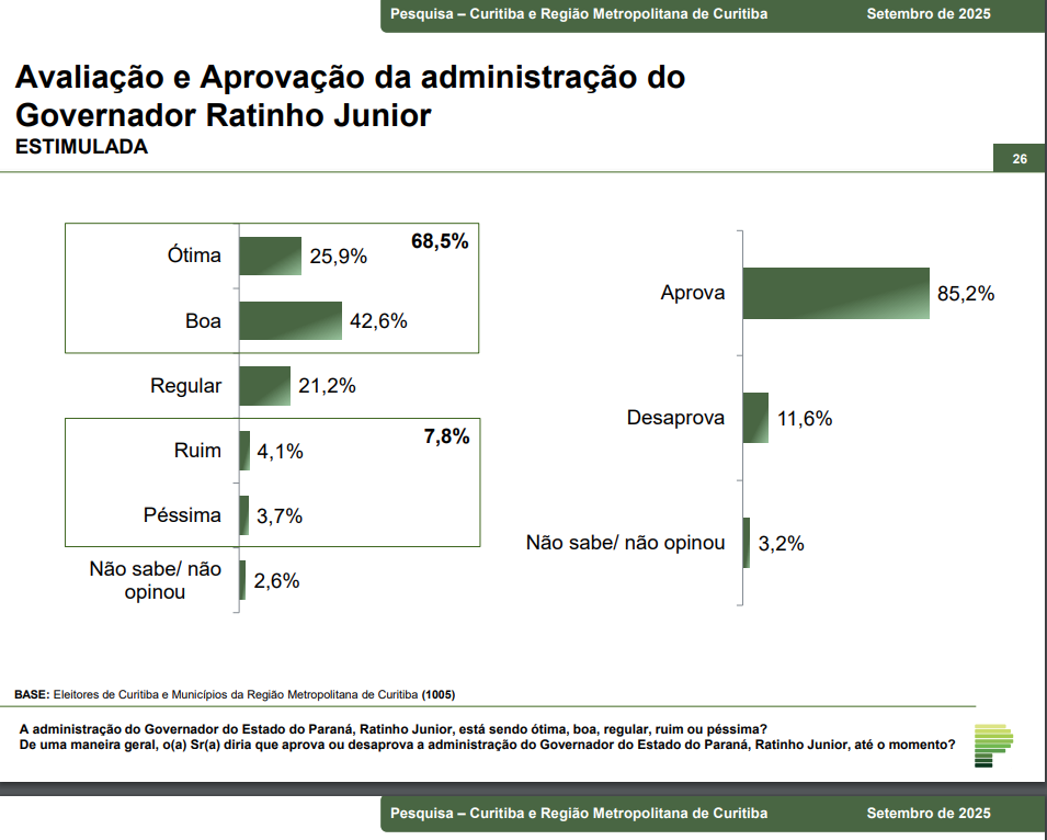 Ratinho Junior tem aprovação de 85,2%, aponta nova pesquisa