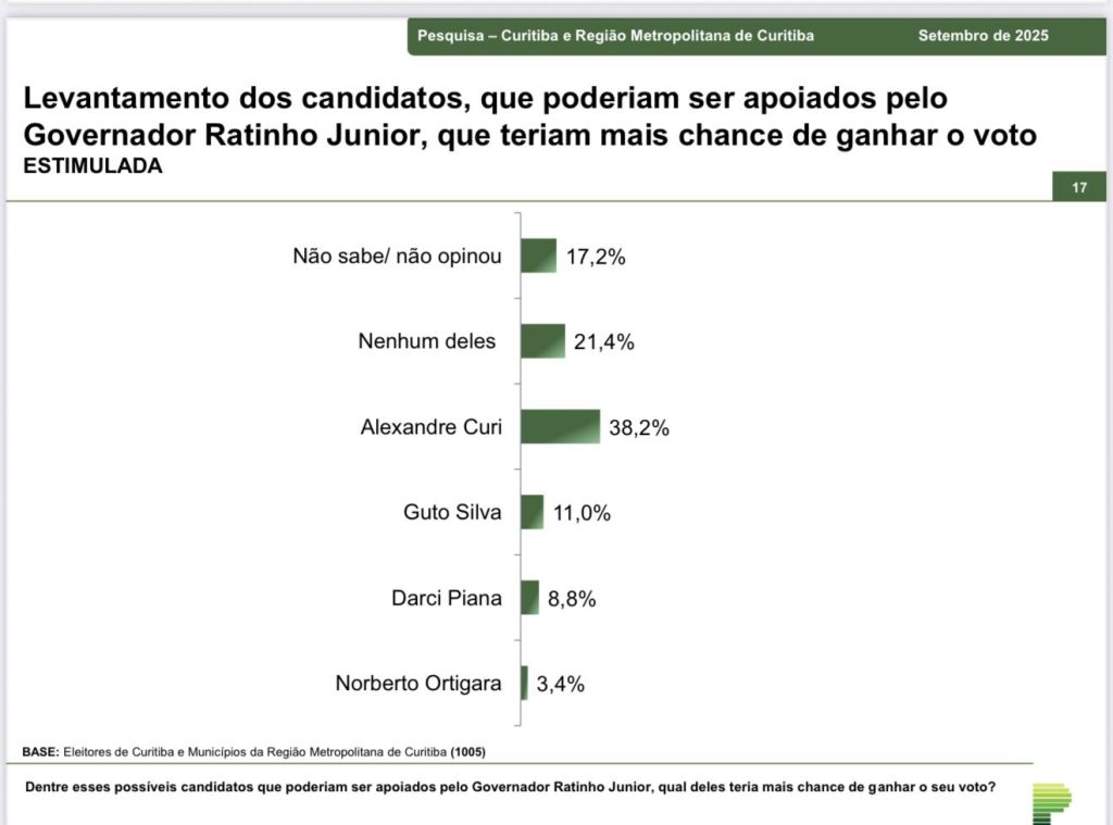 Já entre os possíveis candidatos que poderiam ser apoiados pelo governador Ratinho Junior, para as eleições do próximo ano, o presidente da Assembleia Legislativa, Alexandre Curi, é o principal destaque e aparece em primeiro lugar para assumir o cargo, com 38,2% dos votos dos entrevistados.